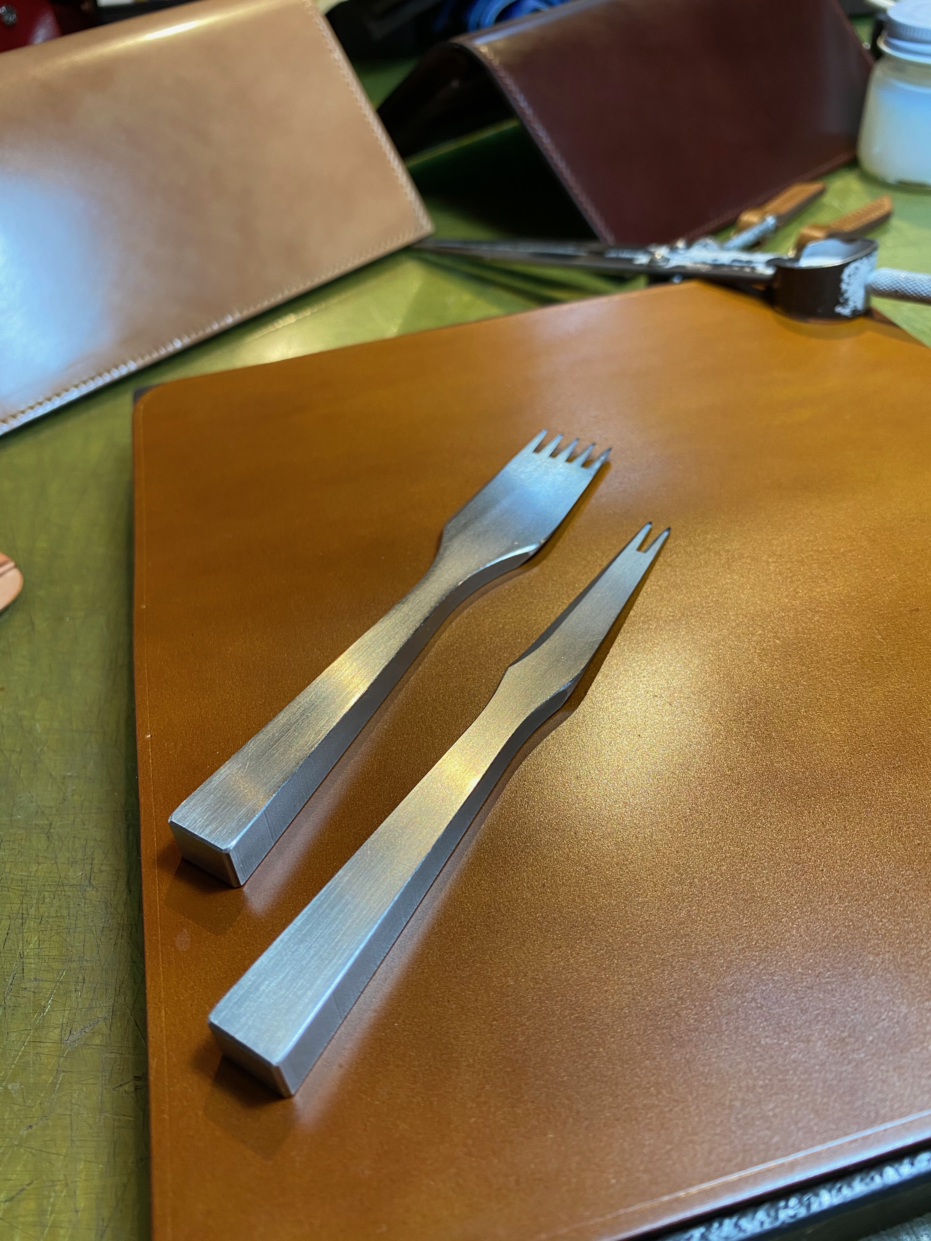 以下の写真は、内装が素材が牛ヌメ革ベージュのパーツになりますが、手縫いの前には、菱目打ちという工具を使って手縫い用の縫い穴を開けていきます。外装のコードバンパーツと内装パーツを別々に縫い穴を開けていくのですが、パーツを貼り合わせた際に穴の位置がズレないように、慎重に菱目うち作業を進めていきます。
